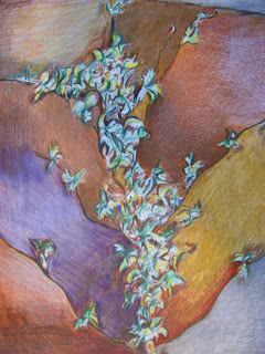 This is a drawing I did sometime ago. It is a depiction of weeds that were growing up between my patio blocks. I love to use color pencil and build up the layers the same way you would use paint. When I look at this drawing it feels carved out. $50.00